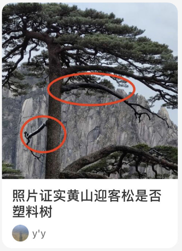 近日,有博主在网上发帖《照片证实黄山迎客松是否塑料树》引发网友热议。照片中,博主圈出迎客松的两根枝桠,疑似是用塑料类的东西包裹或替代了,不过博主认为“整树还是原装的迎客松”。