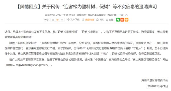 今天下午,橙柿互动记者电话联系了黄山景区核实。景区工作人员表示,其实早在3年前,针对网络上个别自媒体发布不实信息,称“迎客松是塑料树”“迎客松是假树”,少数不明真相网友进行转发转载的情况,黄山风景区管理委员会已经发布过正式声明:网传消息均为不实信息。