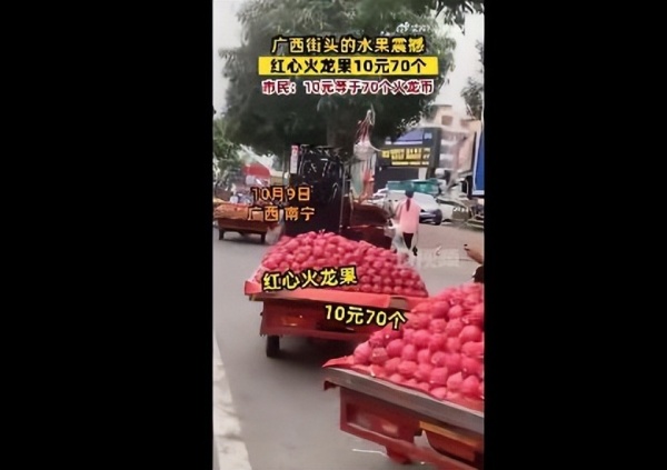 10月9日,广西南宁,卢女士在回家的路上看到街头卖火龙果10元70个,视频发出后引起网友热议。卢女士表示昨天的时候是10元60个,今天就变成10元70个,自己虽说是本地人但是也是第一次看到这个价格,很多外地朋友不相信这个价格。