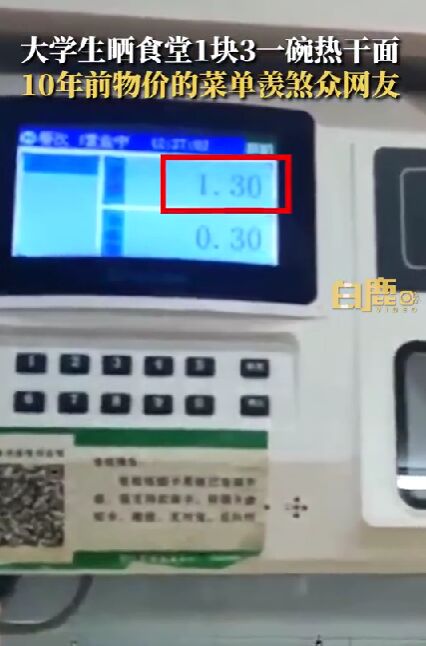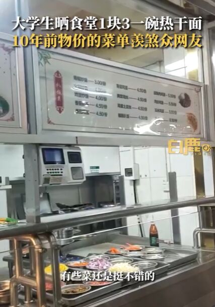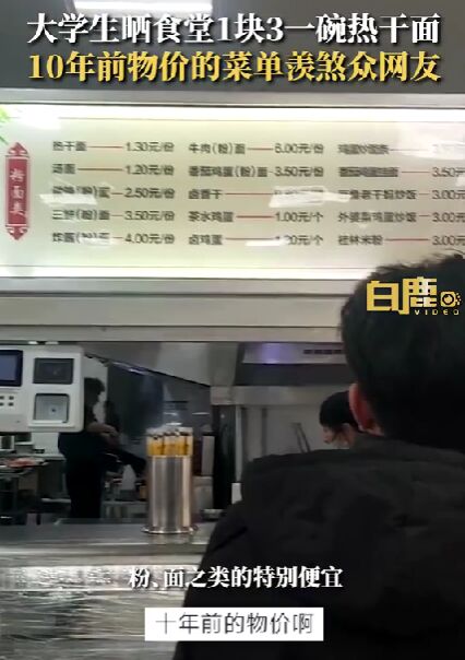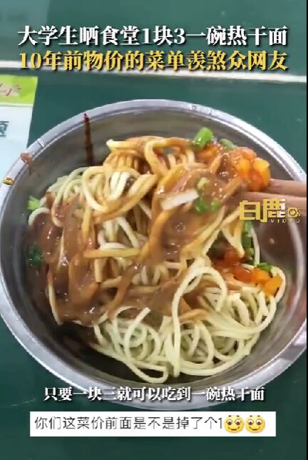 导读:2月22日,湖北武汉,中南民族大学大四的唐同学晒出学校食堂的饭菜价格,羡煞一众网友。唐同学介绍,粉面之类的价格在三四块钱左右,热干面1块3一碗。