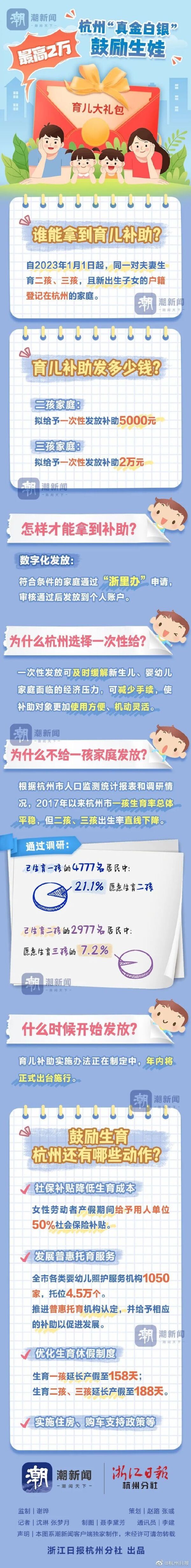 导读:2月22日,杭州市政府2023年度民生实事项目票决出炉,杭州将向同一对夫妻生育二孩、三孩,且新出生子女户籍登记在杭州的三孩家庭一次性发放补助2万元。