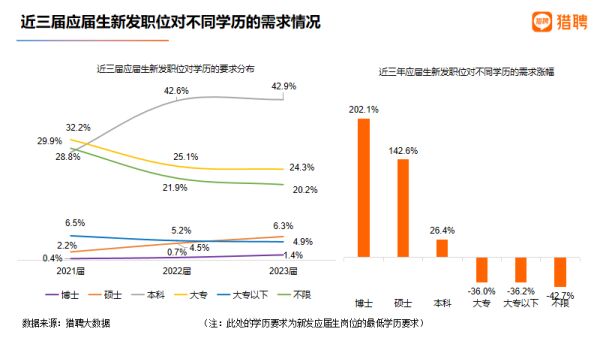 从连续三届应届生新发职位的学历要求分布来看,本科生的需求占比一直居于高位,且呈现持续增长趋势,从2021届的28.8%增长到2023届的42.9%。硕士需求从2021届的2.2%持续增长至2023届的6.3%。博士需求占比也呈增长态势,大专、大专以下和不限学历的应届生需求占比则持续下降。