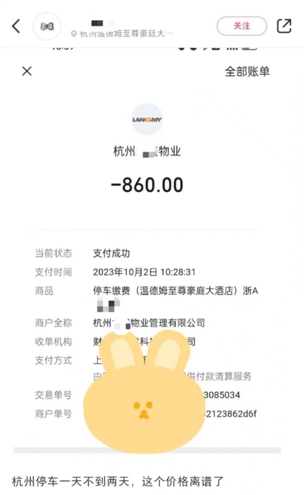 近日,有网友在社交平台上发帖吐槽,称自己国庆期间在杭州温德姆至尊豪廷大酒店停了两天车,结果被收取了860元停车费,“在杭州停车一天多不到两天,这个价格离谱了。”对于这样高昂的停车费,不少网友表示确实太高。