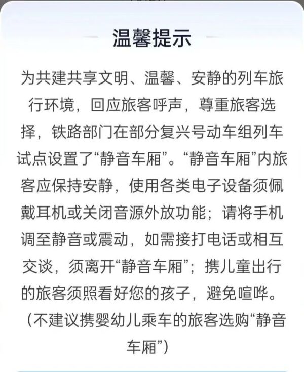 四班列车设有静音车厢