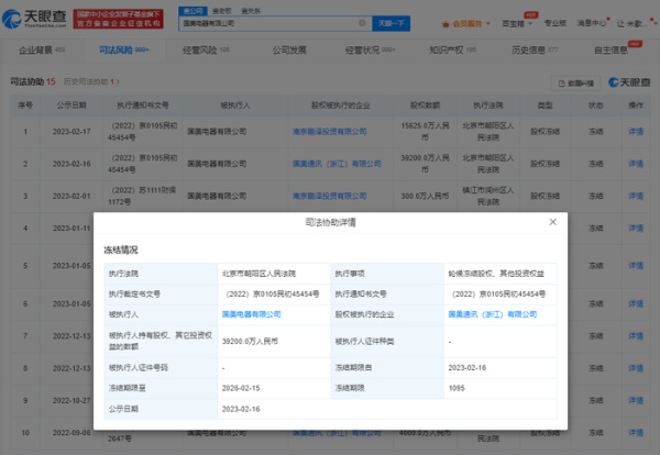 导读:近日,国美电器有限公司新增多则股权冻结信息,冻结股权数额合计超5.9亿元人民币,冻结期限自2023年2月16日至2026年2月16日。