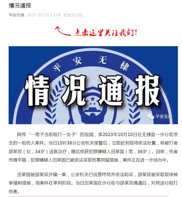 通报称,网传“一男子当街殴打一女子”的视频,系2023年10月10日在无棣县一步行街发生的一起伤人案件。当日15时38分公安机关接警后,立即赶到现场依法处置,将被打者邵某双(女,34岁)送医治疗,随后抓获犯罪嫌疑人田某国(男,36岁)。目前,伤者伤情平稳,犯罪嫌疑人田某国已被依法采取刑事拘留措施,案件正在进一步侦办中。