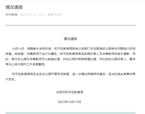 新京报讯 近日,辽宁沈阳,一位家长反映自家孩子遭幼儿园老师虐待,并在午饭后被迫吃下呕吐物。10月13日,沈阳市和平区教育局发布情况通报:经核查,涉事教师不当行为属实。和平区教育局责成该园负责人及涉事教师向家长道歉,同时,责令幼儿园对涉事教师予以辞退处理,对幼儿园作降级降星处理,并约谈幼儿园负责人,要求其马上进行园内工作全面整顿。和平区教育局将在全区幼儿园开展专项排查,进一步强化师德师风建设,坚决杜绝此类事件再次发生。