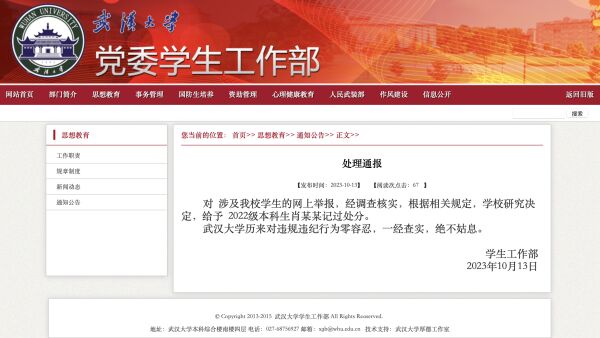 导读:脉络· 事情详述 新京报讯 据武汉大学学生工作部官网消息,对涉及我校学生的网上举报,经调查核实,根据相关规定,学校研究决定,给予2022级本科生肖某某记过处分。武汉大学历来对违规违纪行为零容忍,一经查实,绝不姑息。学生工作部2023年10月13日 更多阅读:武汉大学回应“学生举报遭受性骚扰”:已成立工作组编辑 邓淑红 255, 108, 233, 69, 248, 45, 60, 144