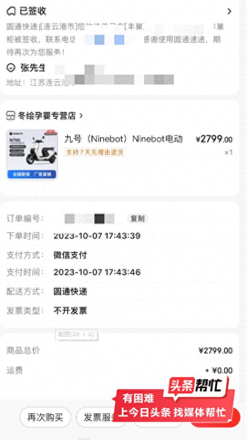 张先生告诉晨意帮忙记者,10月7日,他在京东平台上一家名为冬绘孕婴专营店的店铺内,付款2799元购买了一台电动车。“我没有在官方店铺购买,是一个第三方卖家,因为我比价发现,比官方店铺便宜了三四百元。”