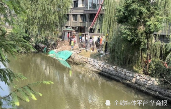 事情发生在升龙桃花園著尚院。事发小区的南侧有一条河道连接长江,系江岛上的排洪河道。塌陷倒灌的缺口离亚鹏路的桥面不远,一台混凝土泵车停在路上,长长的管臂伸向塌陷的缺口处,已经灌浆完毕,现场工人正在搬运钢管用于加固。