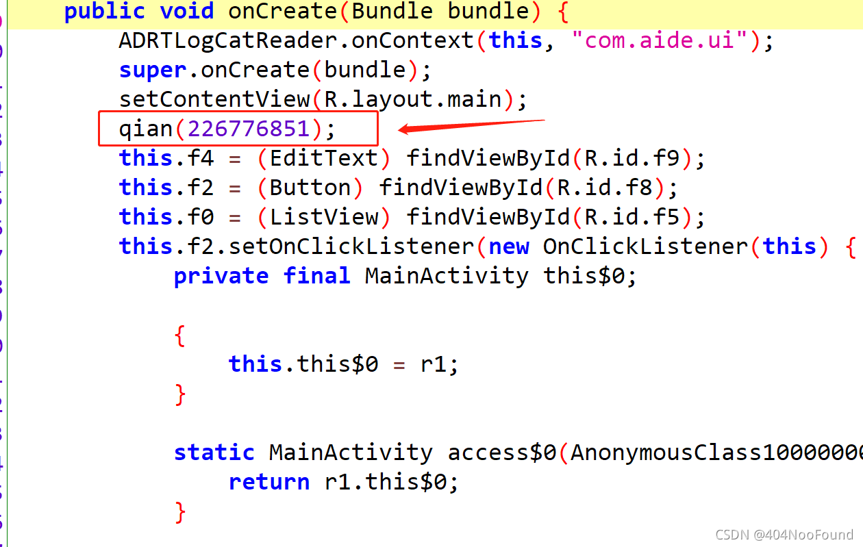 签名校验一般都是在MainActivity.java的OnCreate函数中做,或者是在原生代码文件的JNI_OnLoad函数中做,首先查看OnCreate,里面有个qian,跟进去看看。