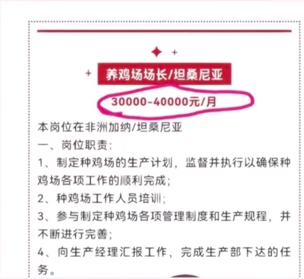 2月23日,据九派新闻视频报道,山东青岛一企业称月薪3-4万招聘养鸡场场长,工作地点在坦桑尼亚,引发网友关注。对此,工作人员称只要工作经验足够,是可以达到所说的工资标准的。