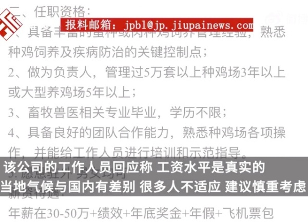 导读:2月23日,山东青岛一企业称月薪3-4万招聘养鸡场场长,工作地点在坦桑尼亚,引发网友关注。对此,企业回应:不招20岁以下年轻人,现在很多人投简历。
