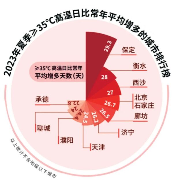 同时,今年的体感高温日数也较常年明显偏多,仅河北省就有7个城市(保定、衡水、石家庄、廊坊、承德、邯郸、唐山)体感高温日数比常年平均增加20天以上。