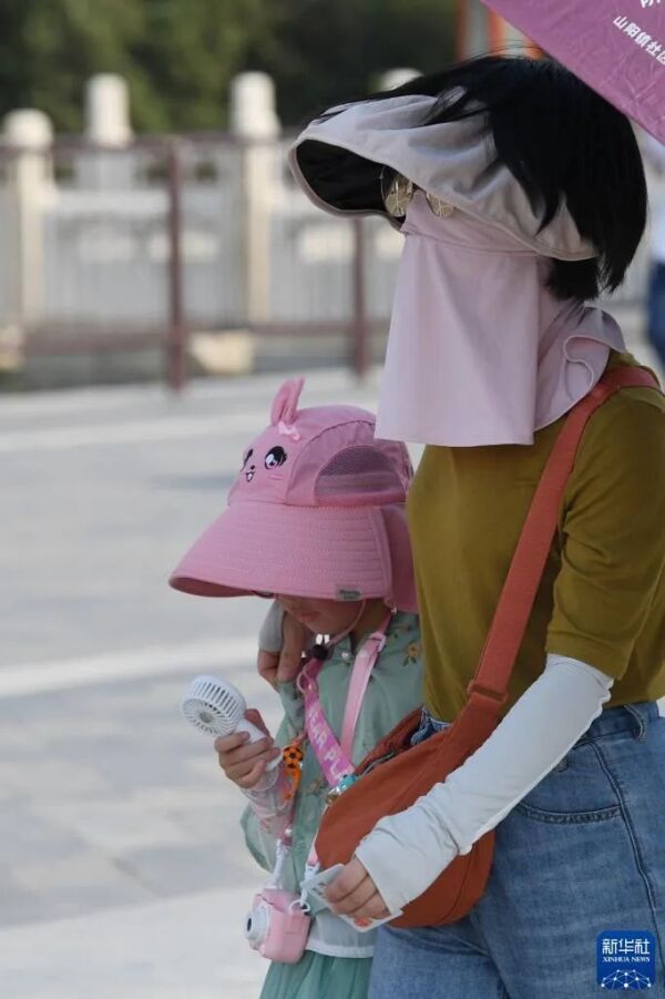 6月23日,北京市气象台发布高温红色预警信号。在北京天坛公园,一位家长带着孩子,穿戴着防晒装备进行游览 图片来源:新华社