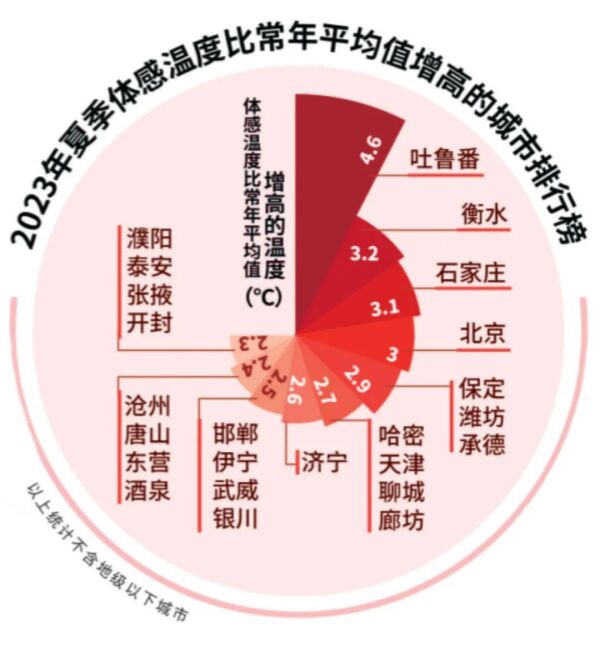 统计显示,今年的炎热是有数据依据的。在全国301个地级以上城市中,有34个城市白天平均体感温度比常年平均偏高2℃以上,偏高1℃至2℃的有114个,这些偏高较多的城市主要位于华北和西北地区。