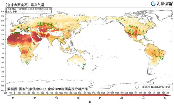 2023年7月全球最高气温分布(单位:℃)及突破历史同期极值站点分布(绿色圈) 图片来源:国家气象信息中心