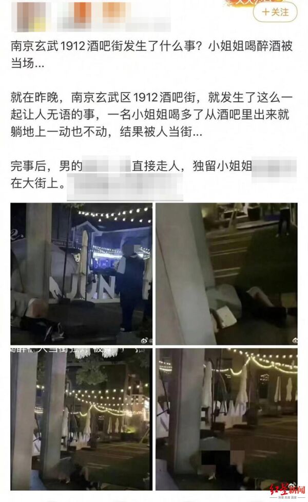 10月17日,一段醉酒女孩疑遭男子当街侵犯的视频引发网友关注。据相关视频截图显示,涉事男子衣衫不整伏在一倒地女生身上。另外,有网友在10月16日发博称,10月15日晚上,在南京玄武区1912酒吧一条街,一名醉酒女子遭人当街性侵,数名路人围观甚至拍摄视频,却无人出面制止。