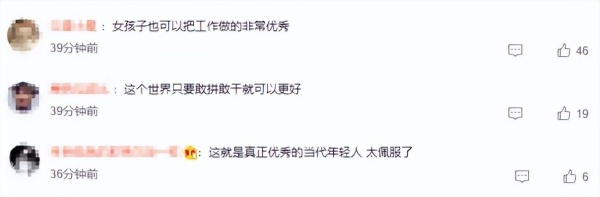 对此网友也纷纷为这名90后女孩点赞,“女孩子也可以把工作做的非常优秀”,“这就是真正优秀的当代年轻人,太佩服了”,“这个世界只要敢拼敢干就可以更好”。
