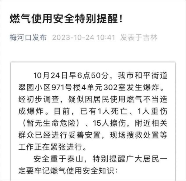 “梅河口发布”就此事发布消息称,10月24日早6点50分,梅河口市和平街道翠园小区971号楼4单元302室发生爆炸。经初步调查,疑似因居民使用燃气不当造成爆炸。目前,已有1人死亡、1人重伤(暂无生命危险)、15人擦伤,附近相关群众已经进行妥善安置,现场搜救处置等工作正在紧张进行。