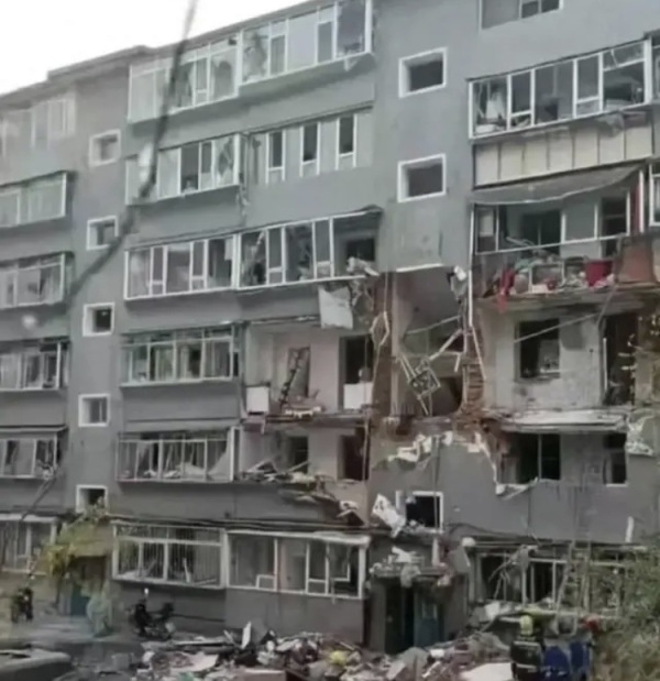 奔流新闻记者注意到,发生爆炸的971号楼是一栋六层老式楼房,爆炸点外墙被炸出了个“大窟窿”,部分楼体坍塌,一至六楼窗户玻璃均有不同程度的破碎,爆炸冲击波造成本栋楼和附近楼房窗框变形受损,现场一片狼藉。