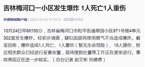 据央视新闻客户端报道,10月24日早6时50分,吉林省梅河口市和平街道翠园小区971号楼4单元302室发生爆炸。经初步调查,疑似因居民使用燃气不当造成爆炸。截至目前,爆炸造成1人死亡、1人重伤(暂无生命危险)、15人擦伤,附近相关群众已经进行妥善安置,现场搜救处置等工作正在紧张进行。事故原因正在进一步核实。