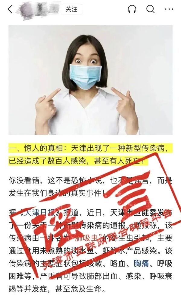 新京报讯 据天津辟谣官微消息,接举报,网上正在传播“天津出现一种新型传染病--肺吸虫病,已导致数百人感染,其中10多例死亡”“天津市已发现了500多例肺吸虫病例,其中有10多例死亡”“一天确诊5000人”等相关信息,引发部分市民恐慌。经核实,以上内容为虚假信息。今年以来,天津市专业部门未接到肺吸虫病例报告。