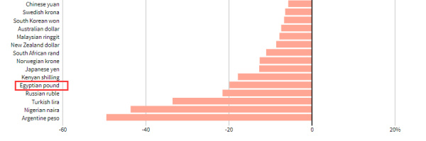 一组统计显示,埃及镑兑美元汇率在今年已累计下跌了近20%,在业内统计的30多类主要非美货币中排名倒数第五。