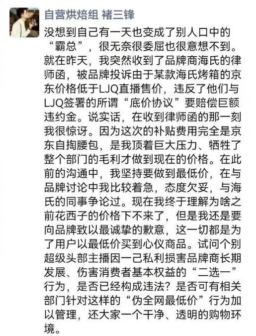 好不容易这件事情平息了,10月24日,李佳琦却再次被推上风口浪尖,先是京东公开喊话李佳琦只顾自己利益,和商家签订所谓的“底价协议”,以此来垄断市场,抬高产品价格。