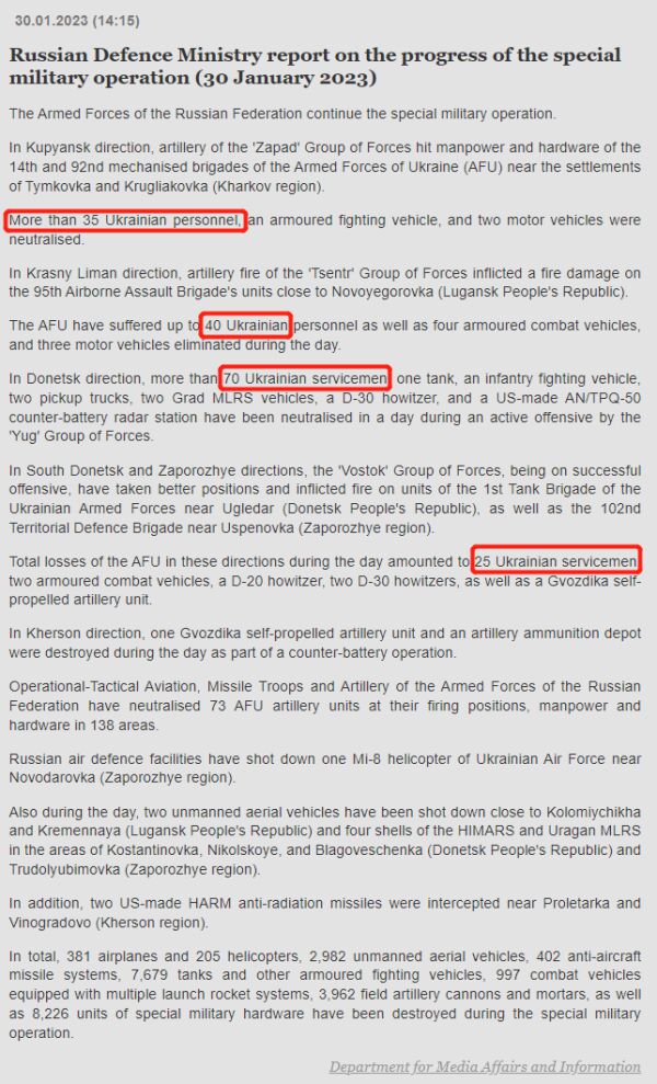 今年2月,据塔斯社报道,绍伊古在俄国防部的一次内部会议上提到,乌军在今年1月至少损失了6500名军人。“澎湃明查”对1月中俄国防部每日简报中提到的各战役乌军损失人数进行了统计(其中1月15日的数据缺失),发现报告中提到的消灭乌军的约数为6915名,其中不包括报告单独提到的“200名雇佣兵”和55名“极端分子”。这一数据与绍伊古报告的数据基本相符。