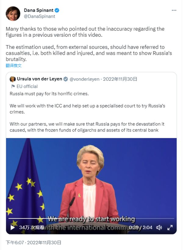 但这一数字显然不会得到乌政府的承认。去年11月30日,欧盟委员会主席冯德莱恩在一次公开讲话中疑似出现口误,称当时乌克兰已有100000将士和20000平民死亡。此话一出,引起乌方激烈反应。欧盟委员会发言人斯皮南特(Dana Spinant)在个人推特上迅速回应,称冯德莱恩提到的数字并不准确,该数字是从外部来源获得,旨在代表乌军的总伤亡人数。