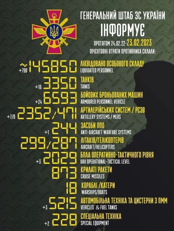 作为战场上的敌对方,乌克兰每天都在统计俄军的阵亡人数。乌武装部队总参谋部官方Facebook发布的最新海报声称,截至2023年2月21日,俄军在乌克兰战场上被“清算”的人数已达到145850人。