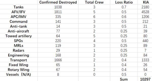 Oryx组织公布的乌军的武器损失总数在3000件左右,其中1904件被毁,包括278辆坦克,178辆装甲战车,346辆步兵战车,123辆装甲运兵车等。使用@osint_east的估值计算,这些装备损失对应的乌军阵亡数在3630人左右。但鉴于Oryx只收集武器装备的视觉资料,且有网友指出Oryx总体上可能具有亲乌克兰的立场。因此,乌军的实际装备损失可能要远大于Oryx所列数据。
