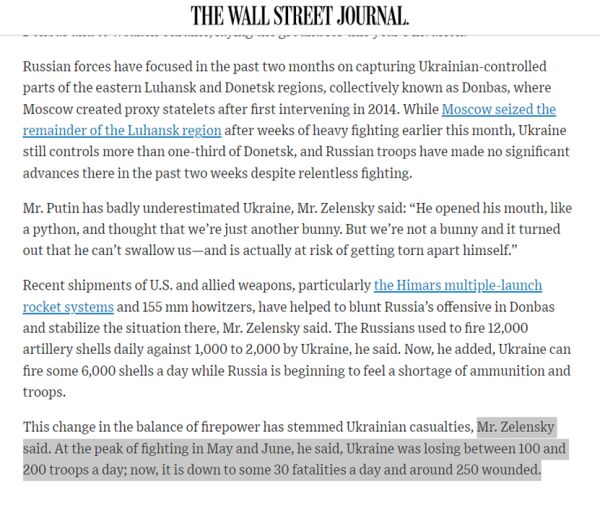 到了去年7月底,由于西方武器的供应,乌军的境遇有所好转。在接受《华尔街日报》的采访时,泽连斯基表示,乌克兰武装部队的日损失已减少到每天 30 人死亡和 250 人受伤左右。他同时提到,在 5 月和 6 月的战斗高峰期,乌克兰每天要损失 100 至 200 名士兵。