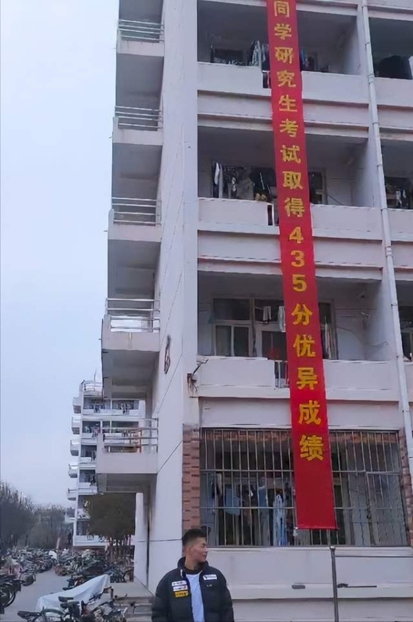 画面中,横幅长达15米,写着“祝贺朱同学研究生考试取得435分优异成绩”。