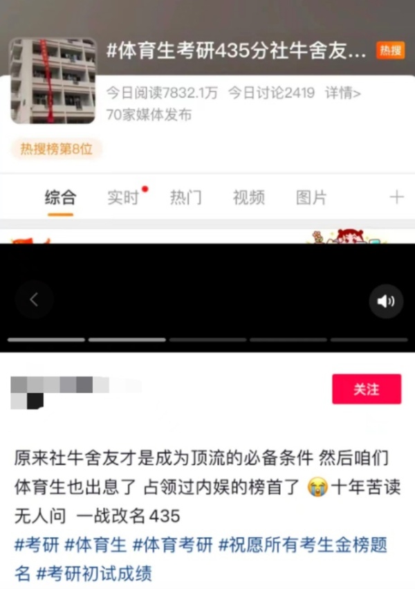 2月24日,该消息冲上热搜后。当事人再次发文感谢舍友:原来社牛舍友才是成为顶流的必备条件。然后咱们体育生也出息了,占领过内娱的榜首了。十年苦读无人问,一战改名435。
