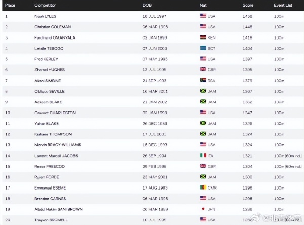 世界田联官网最新数据显示,男子百米世界排名中,已经没有了苏炳添的名字,目前排名最高的中国选手是谢震业,位列世界第27位。