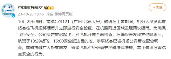 10月29日9时,南航CZ3121(广州-北京大兴)航班在上客期间,机务人员发现有旅客往飞机投掷硬币并立即进行安全检查,在机腹附近区域发现两枚硬币。为确保飞行安全,公司决定推迟起飞,对飞机开展全面检查,在确保未发现其他隐患后,航班于13:29起飞,16:00安全抵达目的地。涉事旅客已被机场公安带走配合调查。南航提醒广大旅客朋友,乘坐飞机时务必遵守民航法律法规,禁止做出危害航空安全的行为。