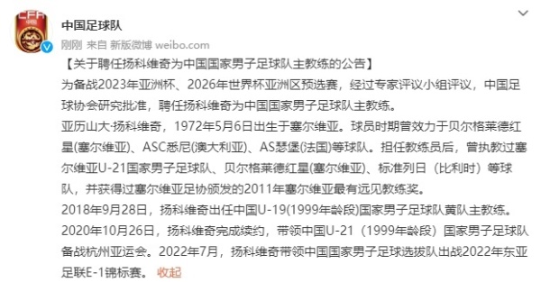 为备战2023年亚洲杯、2026年世界杯亚洲区预选赛,经过专家评议小组评议,中国足球协会研究批准,聘任扬科维奇为中国国家男子足球队主教练。
