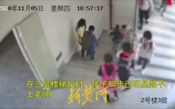 根据学校监控画面显示,10:54放学后,学生们陆续收拾书包离开,此时多多也站起来收拾东西,老师鲍某倚在讲桌上并未上前询问。根据另一段监控画面显示,之后多多自行走出教室,走路有些摇晃,面露哭色相。10:55,鲍某从多多身边走过,没有注意到他,而是直接走向洗手池。10:56,鲍某洗完手后返回走廊上的学生队伍中,随后搀扶多多下楼。“当时班长报告了老师,她才去询问多多情况。当时路过的孩子回忆说,多多当时已经说他走不动了。”陆女士表示,据了解学校是有电梯的,但老师并未让孩子乘坐电梯,也没有帮他拿包。视频画面显示,在三层楼梯口时,多多脚步已经东倒西歪,非常吃力,想要借助扶梯栏杆保持平衡,但由于扶梯一侧不断有学生快速通过,多多被鲍某拉到靠墙处,继续被搀扶着一只胳膊下楼。10:57,多多进入监控死角,大约两秒钟后,他摔倒在三到二楼拐角处,几名同学被声音吸引回头。