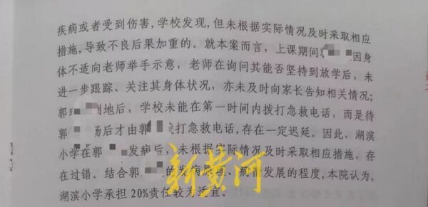 导读:近日,“福州8岁男孩身体不适举手7次后离世”一事引发关注。目前,该案一审判决学校承担20%责任,家长不满判决结果上诉,该案进入二审阶段。