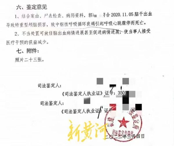监控画面显示,11:02,郭先生才到达现场,此次距离多多倒下已经过去了5分钟。根据11月5日医院出具的多多入院记录显示:头颅CT检查为脑干出血。郭先生夫妇认为,学校方面没有及时合理施救,才是孩子最终死亡的主要原因。脑干出血会导致脑干内部的呼吸中枢受损引起呼吸骤停,从而导致大脑组织细胞大面积缺氧,进而出现不可逆转的广泛脑细胞死亡。福建省立医院神经内科主任医师亦在法庭上陈述,孩子的死亡原因还是脑干出血。神经元能多一分钟多一秒钟的抢救时间,都能挽救大量的脑组织,组织损害继续扩大,脑部的损害治疗一般都是争分夺秒。