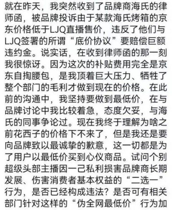 此前,10月24日,京东采销人员称京东价低于李佳琦直播价,违反了海氏品牌与李佳琦的“底价协议”。