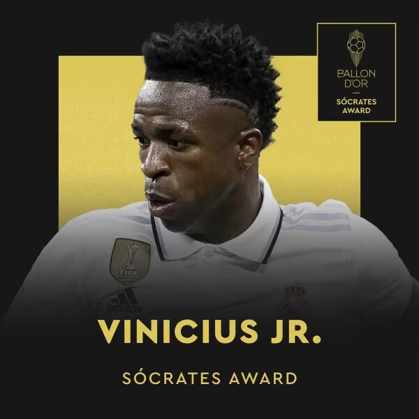 维尼修斯获得2023年苏格拉底奖,表彰他为反种族歧视做出的贡献,以及他所做的社会活动。
