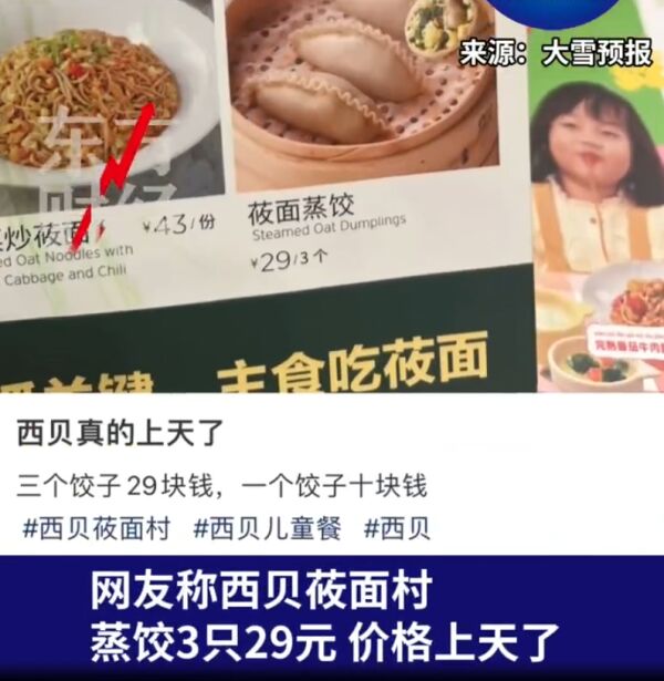 据邯郸广播电视台官方微博,近日,有网友发帖吐槽西贝莜面村的莜面蒸饺3只29元,价格“上天”。