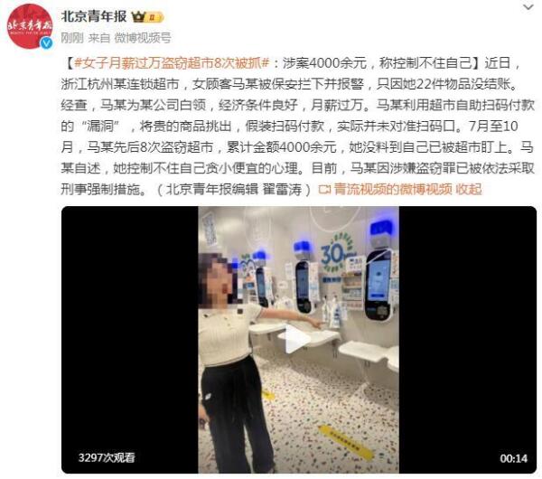 近日,浙江杭州某连锁超市,女顾客马某被保安拦下并报警,只因她22件物品没结账。经查,马某为某公司白领,经济条件良好,月薪过万。马某利用超市自助扫码付款的“漏洞”,将贵的商品挑出,假装扫码付款,实际并未对准扫码口。7月至10月,马某先后8次盗窃超市,累计金额4000余元,她没料到自己已被超市盯上。马某自述,她控制不住自己贪小便宜的心理。目前,马某因涉嫌盗窃罪已被依法采取刑事强制措施。