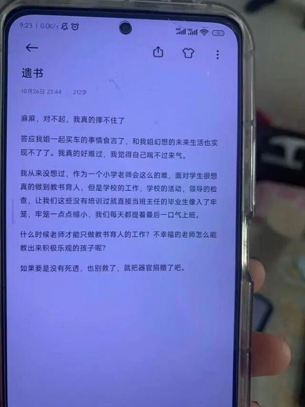 郑州一小学女教师留下遗书后离世,年仅23岁。据报道,警方告诉家属,女教师为自杀。她在遗书中写道,“除教学工作外,应对上级检查,拟写材料等课外行政工作压力大。”