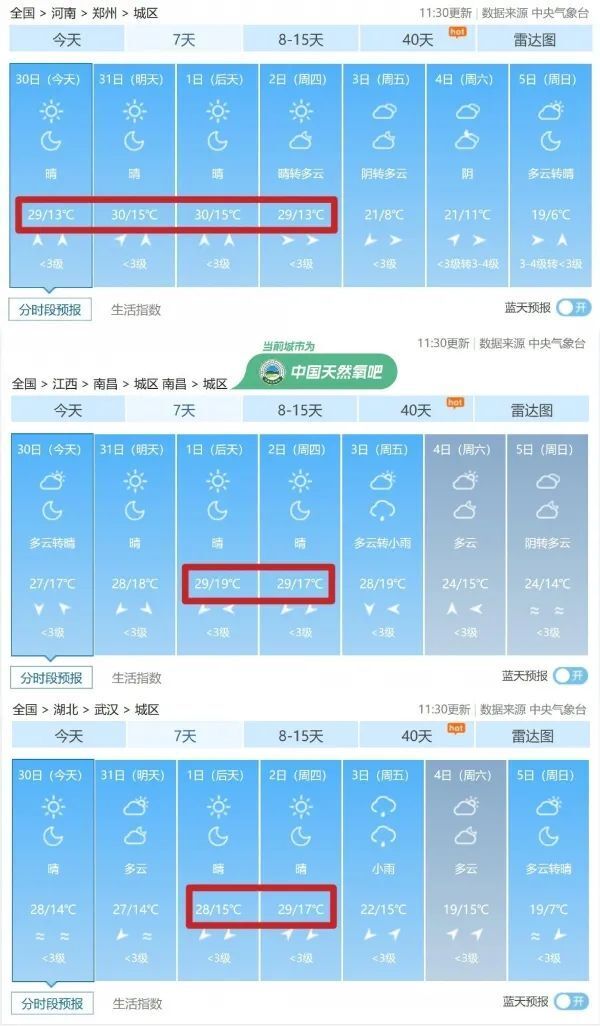 在受到罕见极端回暖影响下的大城市中,郑州可能迎来当地11月观测史上的首个30℃,武汉、南昌的最高气温也将高达29℃。