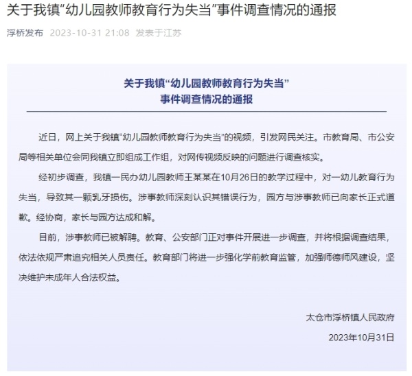 10月31日晚,江苏太仓市浮桥镇人民政府发布通报:
