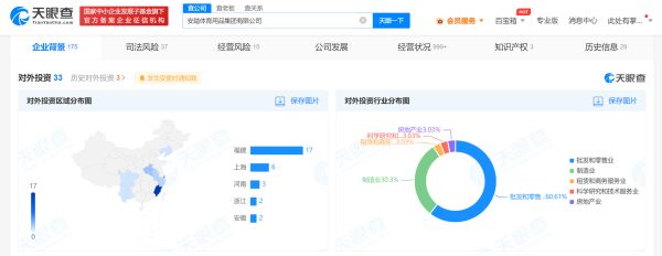 对外投资信息显示,该公司直接持股33家企业,其中29家为存续状态,包括安踏(中国)有限公司、福建安踏物流信息科技有限公司、晋江安心物业管理有限公司、厦门安踏电子商务有限公司等,多为体育用品生产销售相关企业。通过直接或间接持股,该公司拥有90余家企业的实际控制权。此外,安踏于2007年在香港注册安踏体育用品有限公司并上市。